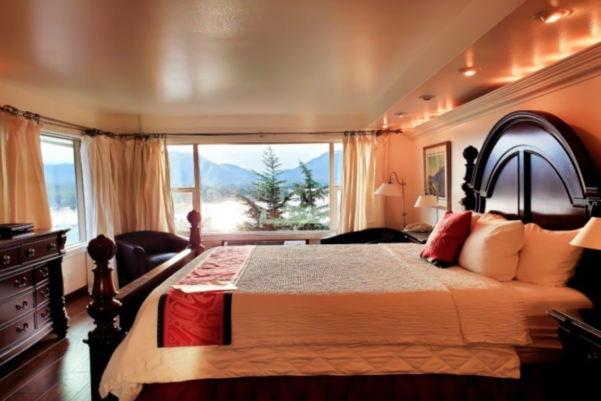Deluxe King Suite Non-Smoking – Perfect for honeymooners! This suite offers a four-post king bed, dimmable track lighting to set the mood, double rodded curtains, two large ocean view windows, a wet bar sink with soundscapes and a bathroom beautifully titled.